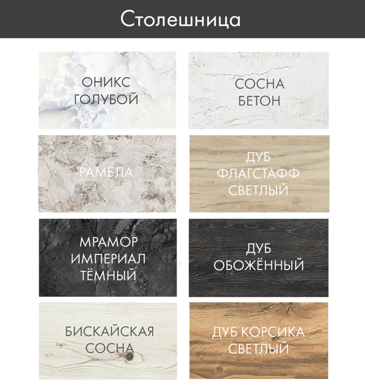 Столешница отдельно на каждый шкаф либо цельная. Цвет столешницы на выбор. Также можно заказать столешницу на шкаф под мойку для установки врезной мойки.